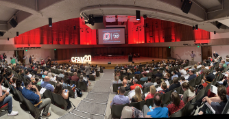 Students, faculty, and staff from the College of Communication, Fine Arts, and Media gathered onstage around a large “CFAM20” sign.