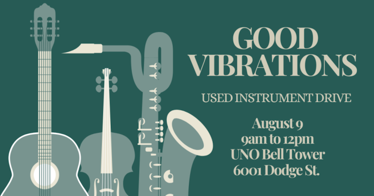 “Good Vibrations Used Instrument Drive,” taking place on August 9 from 9 a.m. to 12 p.m. at the UNO Bell Tower, 6001 Dodge St., featuring illustrations of musical instruments.