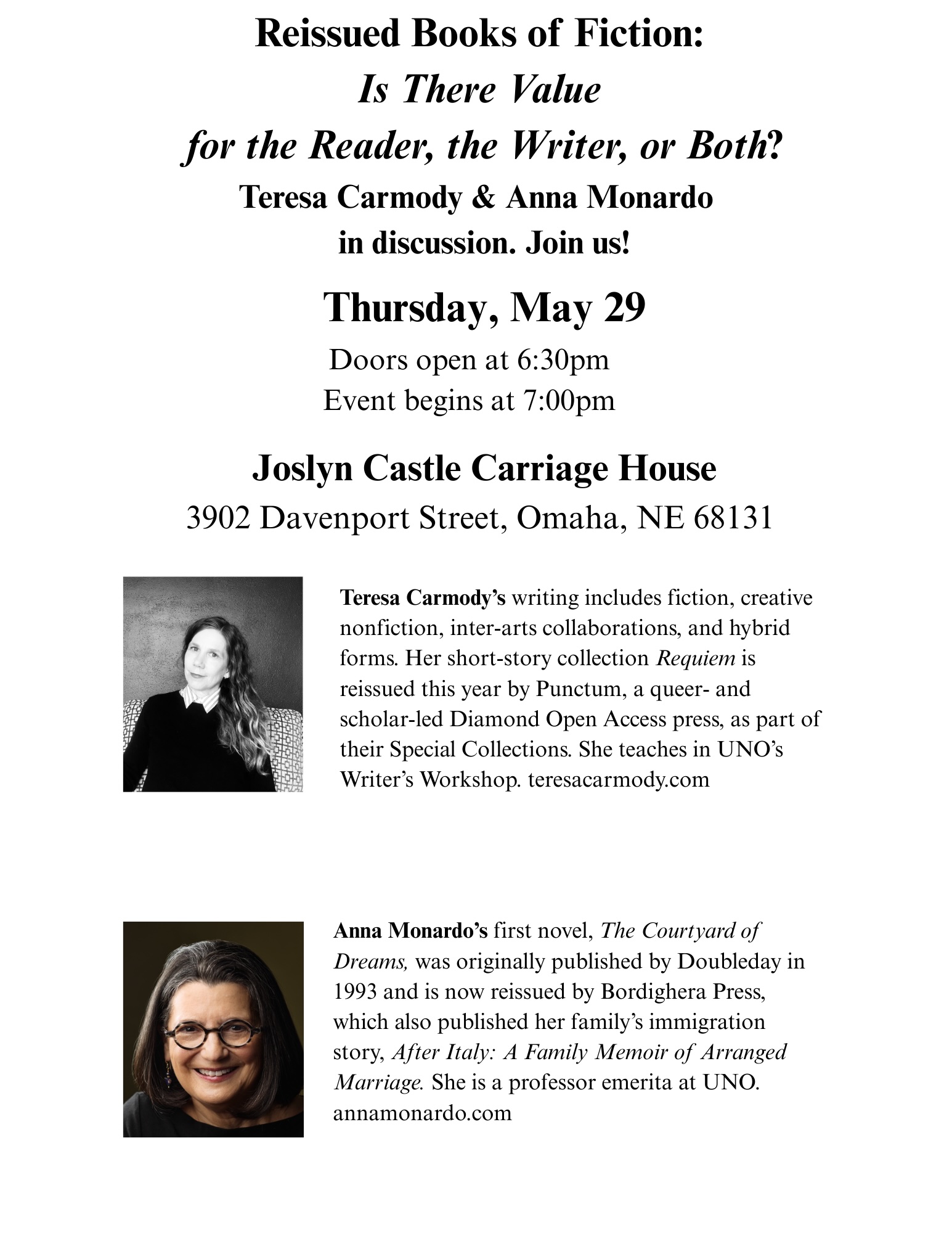 Joslyn Castle 3902 Davenport St, Omaha, NE, United StatesOf interest to the general arts community—specifically, the literary community——two local authors and UNO Writer's Workshop professors talking about their writing process and their publication experiences.