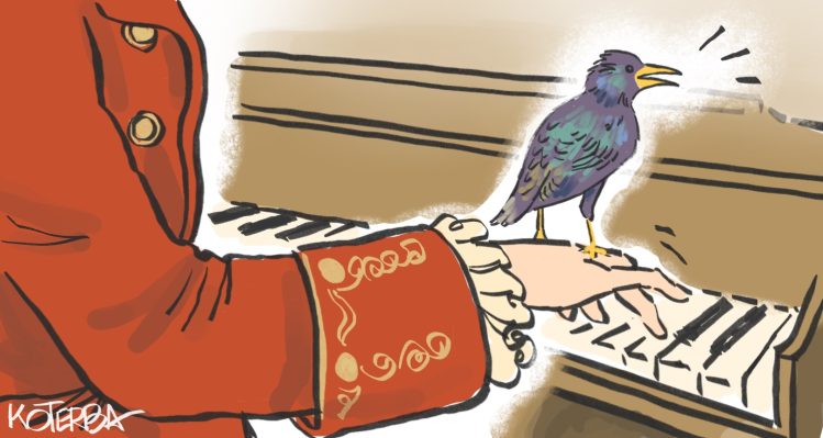 There are some historians who conjectured that Mozart bought the bird because he liked what he heard the bird singing. The same year that he wrote his 17th Piano Concerto, the composer jotted down a musical theme in his expense book, right next to the price he paid for the starling. This musical notation is very close to the opening theme of the final movement of his Piano Concerto No. 17. Did Mozart hear the bird singing this great theme, then buy the creature to possess it? Or did he compose the theme of it himself, then teach the bird to sing it?