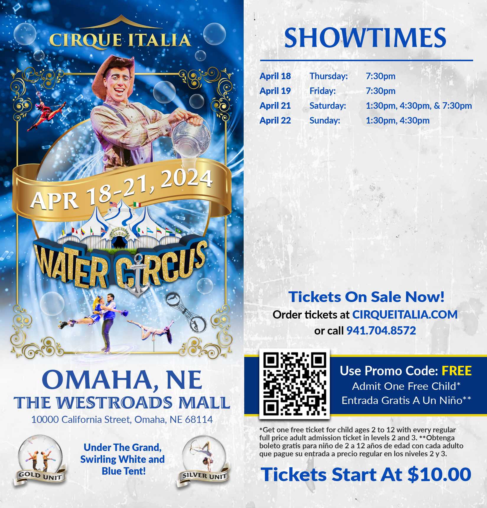Have you ever imagined a country boy’s adventure from farm life to the bustling lights of the big city? Cirque Italia is thrilled to present our new production, a captivating story about Rafael, a farm boy swept away by a tornado who lands in the heart of the city’s chaos. Join us for this extraordinary journey of self-discovery and unity in our upcoming performances in OMAHA, NE!Embark on a comedic escapade with Rafael, the Clown, as he seamlessly transitions from farm life to the dazzling lights of the city, weaving humor into both worlds. As Rafael navigates the city, he encounters many personalities, reflecting the diverse facets of urban life. Our talented performers bring these characters to life, celebrating the rich tapestry of human experience. From the farm to the city, Cirque Italia Silver promises a unique and unforgettable spectacle.Clown #2, our Head of Security, guarantees a hilarious and safe experience for all attendees, ensuring laughter echoes alongside security measures.Witness the striking Trampoline Wall, a new act adorned in graffiti, paying homage to the vibrant street culture of the city. The Straps act showcases the intellectual prowess of nerds, delivering a breathtaking performance that transcends conventional circus boundaries.Marvel at the Rolls Bolla, a sophisticated display reflecting the city’s elite high society, and experience the poignant Fire act, shedding light on the challenges faced by the homeless in the urban landscape. Quick Change introduces a myriad of characters with seamless transformations, adding a touch of formality and funk to the spectacle.Feel the swinging vibes of the Rope act, embracing the free-spirited essence of the ’60s hippie culture, and revel in the rebellious energy of Juggling, injecting a punk-rock flair into the traditional circus ambiance. The Hand to Hand act unfolds a love story amid the hustle and bustle of city life, while Skates captures the high-energy spirit of athletic competition in a cheerleader/jock extravaganza.Concluding the grand performance is the Swing act, a humorous nod to the city’s senior citizens, providing a fitting finale that brings together the myriad characters in an epic country line dance. This unique blend of acts reinforces the show’s central theme – a celebration of diversity, unity, and inclusivity, echoing the timeless ideals of the American circus. Don’t miss the chance to experience the magic as we blend the charm of the countryside with the vibrancy of the city! Join us for a night of laughter, awe, and a celebration of diversity.Manuel Rebecchi, president and owner of Cirque Italia is tremendously proud of his circus heritage and feels extremely privileged to be able to share it with you in such a fun and memorable way.Cirque Italia continues to contribute to the modernization of the performing arts and the circus industry by abiding by a strict animal-free policy.Tickets may be purchased through our website (cirqueitalia.com/tickets) or by phone: (941) 704-8572. We also respond to text messages.For more information, visit www.cirqueitalia.com and make sure to check all our social media accounts.When: April 18th – 21st, 2024Where: 10000 California Street, Omaha, NE 68114At: Westroads Mall— Under the stunning White & Blue Big Top Tent• April 18 – Thursday: 7:30pm• April 19 – Friday: 7:30pm• April 20 – Saturday: 1:30pm, 4:30pm, & 7:30pm• April 21 – Sunday: 1:30pm & 4:30pmBox office hours:The box office opens on-site on Tuesday, the week of the show.Days with no scheduled shows: 10am – 6pmDays with scheduled shows: 10am – 9pm