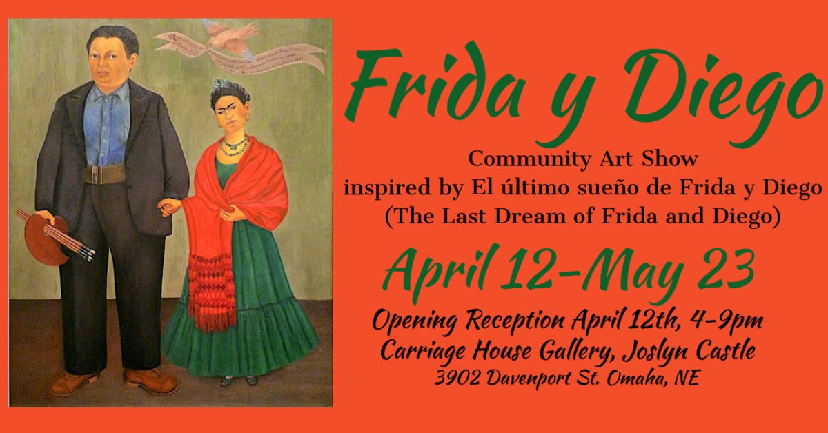 This captivating exhibition seeks to bring another layer of excitement, awareness and engagement to Opera Omaha’s production of the beautiful opera El último sueño de Frida y Diego (The Last Dream of Frida and Diego), a new opera by Gabriela Lena Frank and Nilo Cruz.For this show artists were encouraged to seek inspiration from the opera’s story as well as commemorate the passionate and tumultuous relationship between these two iconic artists, Frida Kahlo and Diego Rivera.Artists from all backgrounds to submited their visual art of any medium influenced by the fascinating love story of Frida Kahlo and Diego Rivera, in a unique opportunity to express their interpretation of the icons’ passionate bond, their artistic endeavors, and their profound influence on each other’s work, the fascinating and beautiful story depicted in The Last Dream of Frida and Diego, and Día de los MuertosThis art show is being produced in collaboration with Opera Omaha, Joslyn Castle, and The Castle and Cathedral Creative District.Frida and DiegoDates: April 12-May 23rdLocation: Carriage House Gallery, Joslyn Castle, Omaha NebraskaOpening Reception: Friday April 12th, 4-9pmClosing Reception: Thursday May 23rd, details TBAA small selection of art from this exhibition will be chosen to be featured at the Orpheum Theater during Opera Omaha’s performances of El último sueño de Frida y Diego.