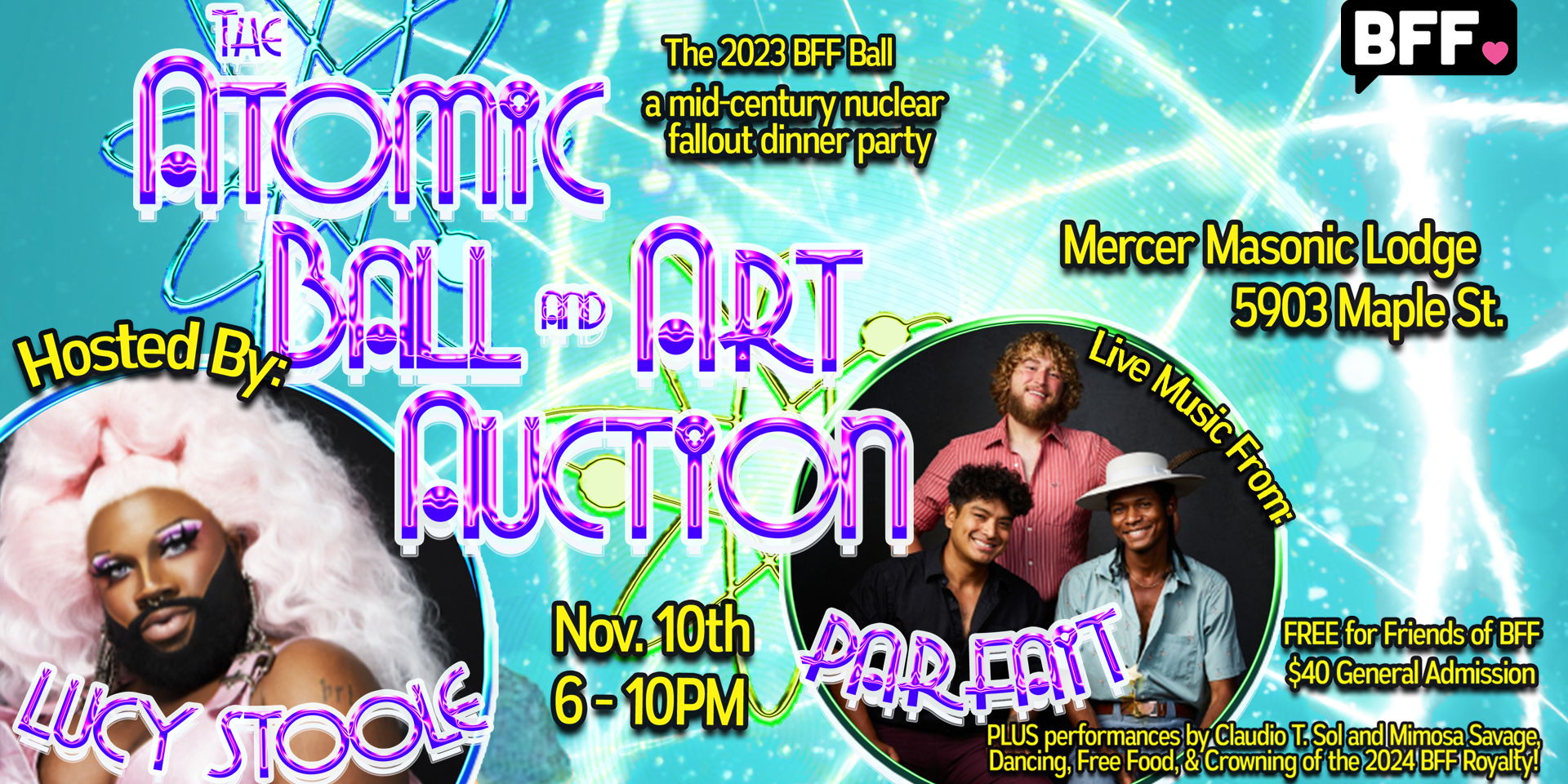 We’re throwing an ATOMIC BALL AND ART AUCTION Friday November 10th! Join your BFFs to dance, eat, and celebrate another year of BFF Omaha!This year’s ball is radioactive! We’re hosting a mid-century nuclear fallout dinner party and art auction at the Mercer Masonic Lodge (5903 Maple Street) and you’re invited!Hosted by Chicago’s Black Bearded Beauty, Lucy Stoole and featuring live music from the genre blending trio Parfait; The Atomic Ball and Art Auction will be a night of fun, dancing, performances, and crowning of the 2024 BFF Royalty!Featuring: Food provided by Nocturnal Eats Food Truck. Performances by Claudio T. Sol and Mimosa Savage. Projection art of Joe.Video. Mid-Century photo op installation by StudioDaze Omaha.FREE ENTRY for all Friends of BFF! $40 General Admission. Purchase a membership today and have your perks in time for November 3rd First Friday! Purchse tickets at https://shopbffomaha.myshopify.com/products/the-bff-ball-atomic-ballThe 2023 BFF Ball – The Atomic Ball and Art Auction is brought to you thanks to our partners Buildtertrend, Omaha Steaks, Nocturnal Eats Food Truck, Benson Brewery, StudioDaze Omaha, Omaha Roller Derby, Shipment Vintage and Flava’s Lounge.