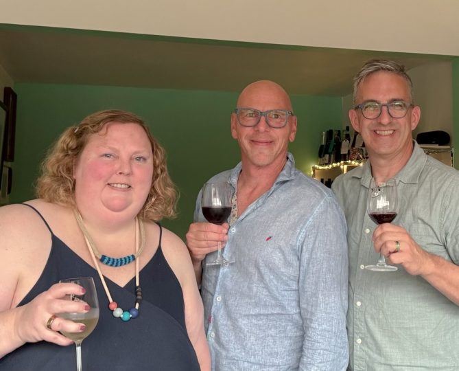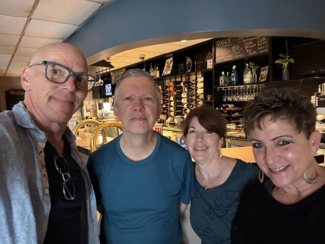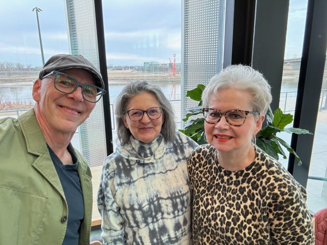 Jeff Koterba with KVNO listeners Stella Sideris and Sue Sideris. Taken at Fig Cafe.