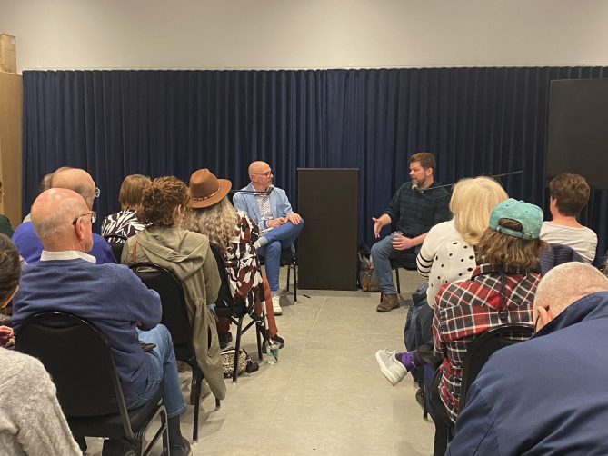 Jeff Koterba speaking with Ted Wheeler on behalf of Alliance Française Omaha at Pottawattamie Arts, Culture & Entertainment.
