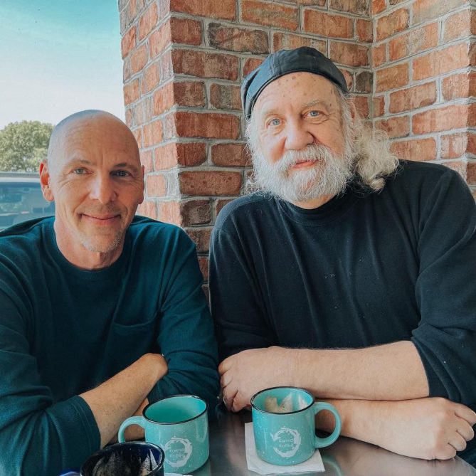 Jeff Koterba and Jack Phillips smiling at Blue Line Coffee in Dundee. The shop is decorated for Christmas.