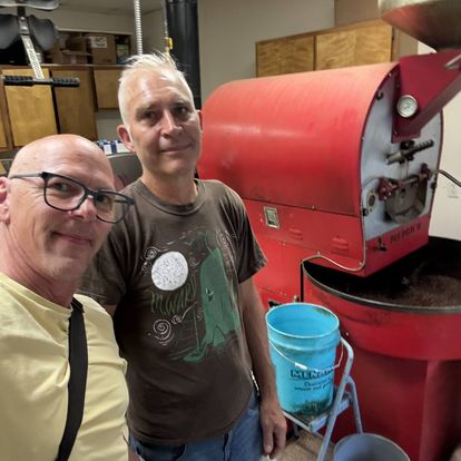 Jeff Koterba and Jack Phillips smiling at Blue Line Coffee in Dundee. The shop is decorated for Christmas.