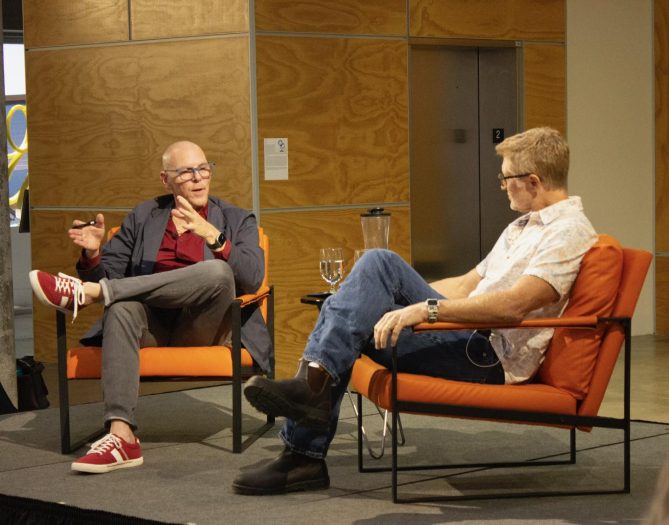 Jeff Koterba speaking with Ted Wheeler on behalf of Alliance Française Omaha at Pottawattamie Arts, Culture & Entertainment.