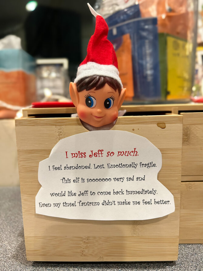 Here’s an update. Yes, this is how my Elf on the Shelf greeted me early this morning. But did he bring treats? Nope. Maybe next time haha…